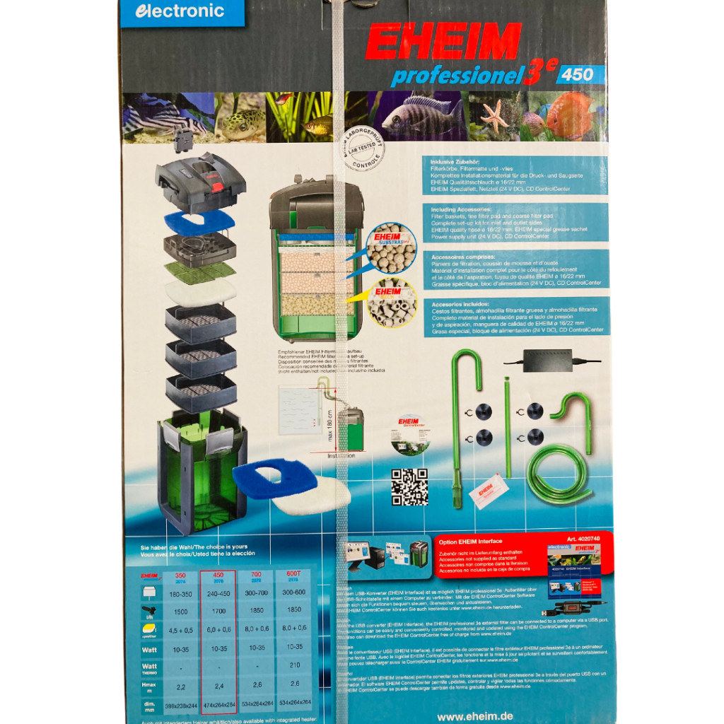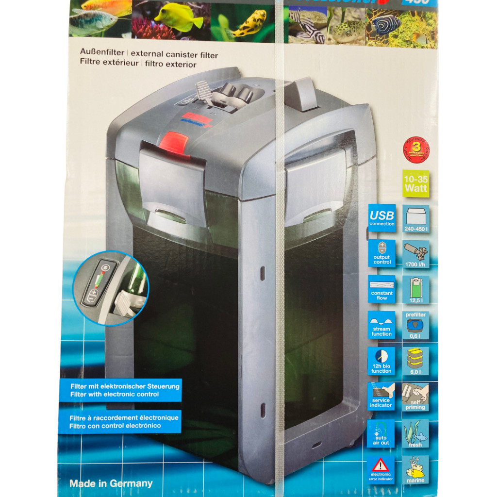 Eheim professionel 3e 450 külsőszűrő 450 l-ig 1700 l/h akváriumi külső szűrő. Mikroprocesszoros vezérlésű, hatékony szűrőrendszer. Tökéletesen tiszta, biológiailag kifogástalan vizet biztosít. Számtalan hasznos kényelmi funkcióval rendelkezik. A könnyen kivehető előszűrő lehetővé teszi a durva szennyeződések eltávolítását a biológiai szűrő megbolygatása nélkül.