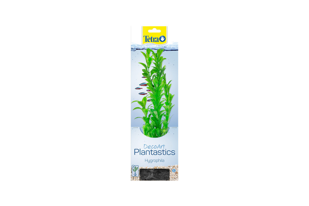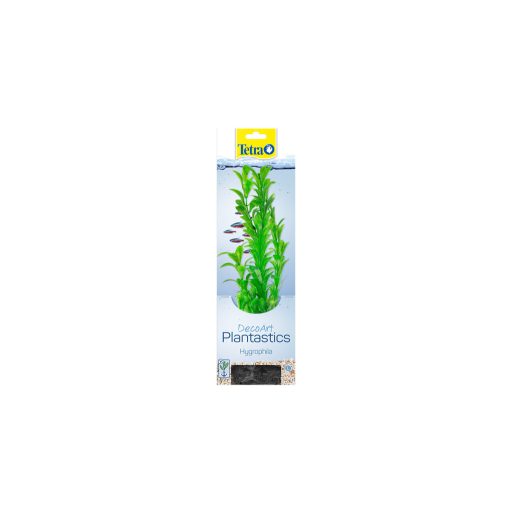 A Tetra DecoArt Plantastics Hygrophila élethű műnövény változata a hygrophila vízinövényeknek. Élénkzöld levelei különösen látványosak. Emiatt gyakran párosítják sötétzöld vagy pirosas levelű akváriumi növényekkel, melyekkel szép kontrasztot alkot. Szintén ideális a szűrő, fűtő és más műszaki berendezések elrejtésére. Az élő növények sokszor megsínylik, ha a szűrő vagy a fűtő mellé kerülnek, a mű változatokra azonban semmilyen rossz hatást nem gyakorolnak ezek a felszerelések. Bár az élő növény összes természetes funkcióját nem tudja kiváltani, az élethű másolat nagyszerű helyet biztosít a halaknak íváshoz vagy rejtőzködéshez. Ráadásul a mű hygrophila nem csak megtévesztően igazinak tűnik az akváriumban, természetes módon mozog együtt az áramlással is. A műnövényeknek egyéb előnyei is vannak. Először is, rendkívül könnyű behelyezni őket az akváriumba, majd kivenni onnan, és egyszerűen a csap alatt tisztíthatók. Ezen kívül igen tartós: hosszú távon sem veszíti el élénk színét és nem deformálódik el. Kis, közepes és nagy méretben kapható (15, 23 és 30 cm), így a a mű hygrophila az akvárium első, középső és hátsó részére is helyezhető igény szerint. A nagy verzió gyakran a víz felszínéig felnyúlik. Összességében a Tetra DecoArt Plantastics Hygrophila változatos és különleges dísze lehet bármelyik akváriumnak.